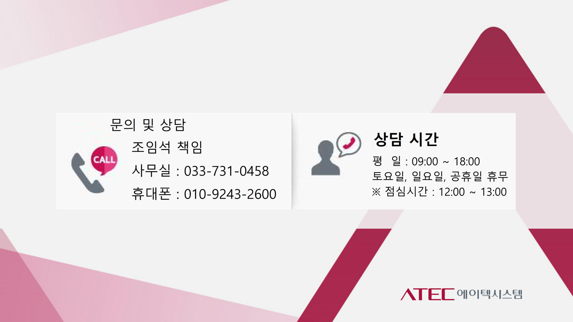 에이텍 원주센터 안내 2023. 4. 17. 15:27 IT기기 하드웨어, 시놀로지 NAS, 조립PC, 모니터 및 소프트웨어, 윈도우 설치 등 문의 상담 공유하기 게시글 관리 ATEC Wonju